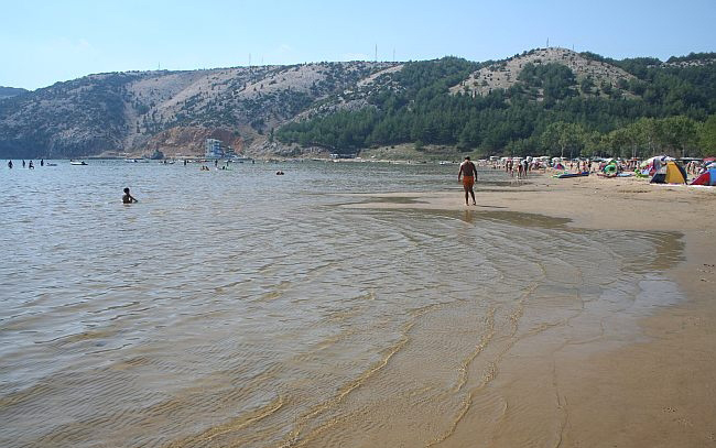 - pješčana plaža, sadrži sitan pijesak, plitko more, veliko parkiralište, restorane, barove, najam barke,